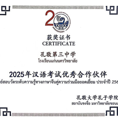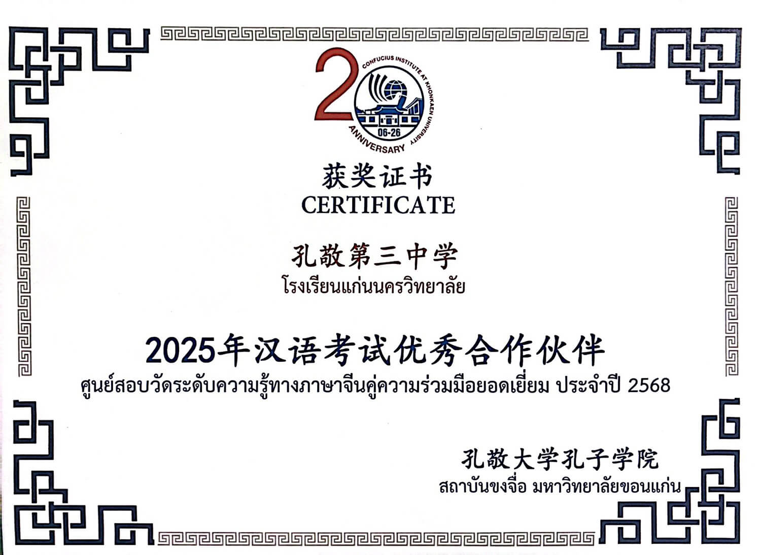 ไม่เพียงแต่ด้านกิจกรรมที่โดดเด่น ด้านวิชาการภาษาจีนของโรงเรียนก็ยังแข็งแกร่งอย่างต่อเนื่อง โดยในโอกาสนี้ ดร.คมสันต์ ชุมอภัย ผู้อำนวยการโรงเรียนแก่นนครวิทยาลัย ได้มอบหมายให้ นางพิชริน ทักษิณ รองผู้อำนวยการกลุ่มบริหารกิจการนักเรียน เป็นตัวแทนเข้าร่วมพิธีรับมอบรางวัลอันทรงเกียรติ: