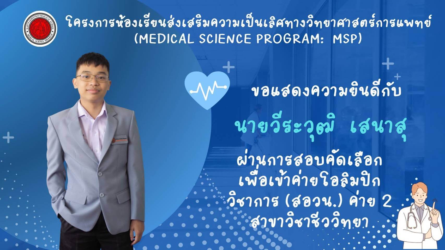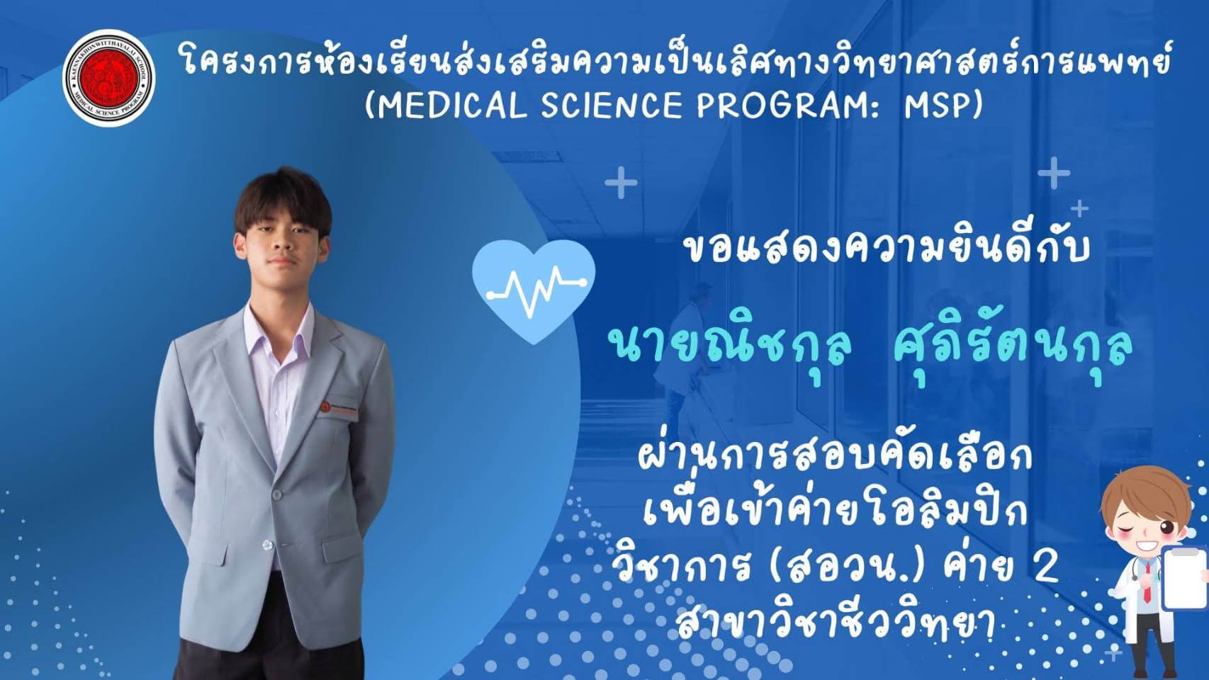 โรงเรียนแก่นนครวิทยาลัยขอแสดงความยินดีกับนักเรียนสองคนที่ผ่านการคัดเลือกเข้าร่วมค่ายโอลิมปิกวิชาการ ค่าย 2 สาขาชีววิทยา ได้แก่ นายณิชกุล ศุภิรัตนกุล และนายวีระวุฒิ เสนาสุ