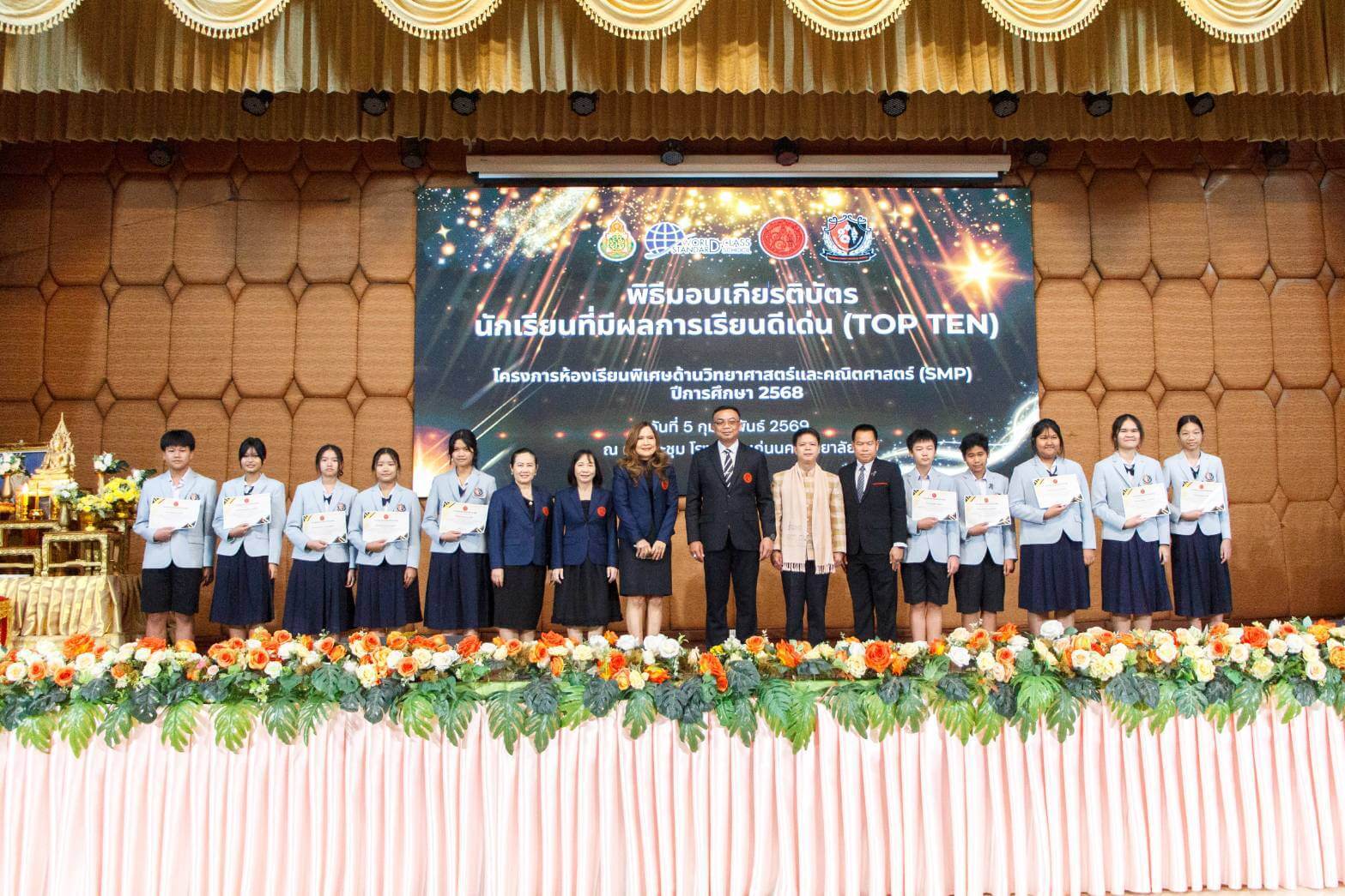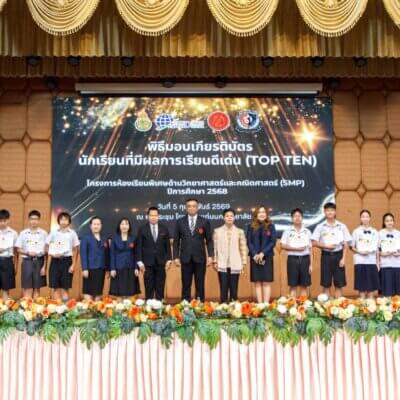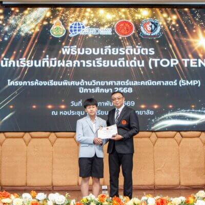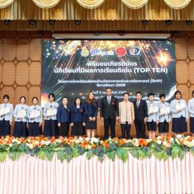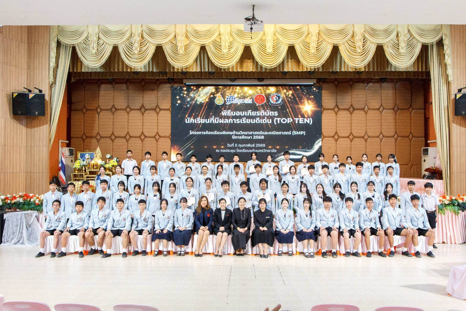เมื่อวันที่ 5 กุมภาพันธ์ 2569 โรงเรียนแก่นนครวิทยาลัยจัดพิธีมอบเกียรติบัตรแก่นักเรียนที่มีผลการเรียนยอดเยี่ยม 10 อันดับสูงสุด (TOP TEN) ในโครงการส่งเสริมนักเรียนที่มีความสามารถพิเศษด้านวิทยาศาสตร์และคณิตศาสตร์ (SMP) ประจำปีการศึกษา 2568 ณ หอประชุมโรงเรียนแก่นนครวิทยาลัย โดยมี ดร.คมสันต์ ชุมอภัย ผู้อำนวยการโรงเรียน ให้เกียรติเป็นประธานในพิธี