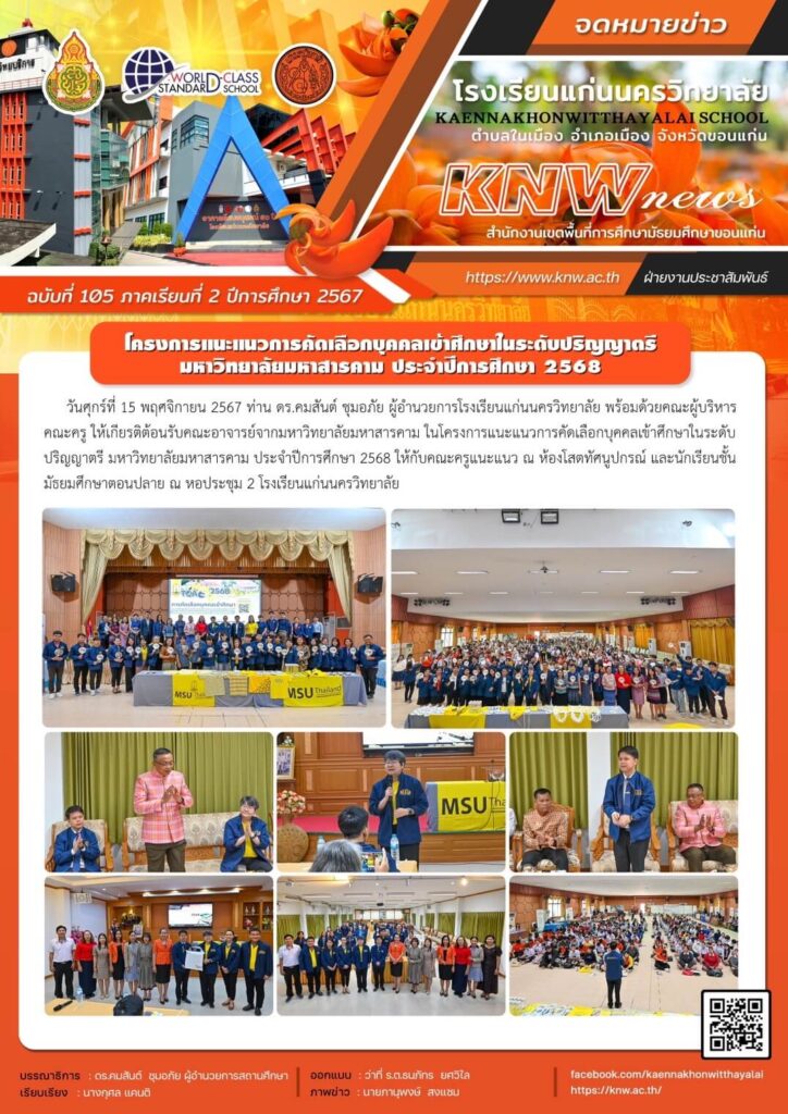 จดหมายข่าว ฉบับที่ 105 ภาคเรียนที่ 2 ปีการศึกษา 2567 เรื่อง โครงการแนะแนวการคัดเลือกบุคคลเข้าศึกษาในระดับปริญญาตรี มหาวิทยาลัยมหาสารคาม ประจำปีการศึกษา 2568