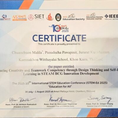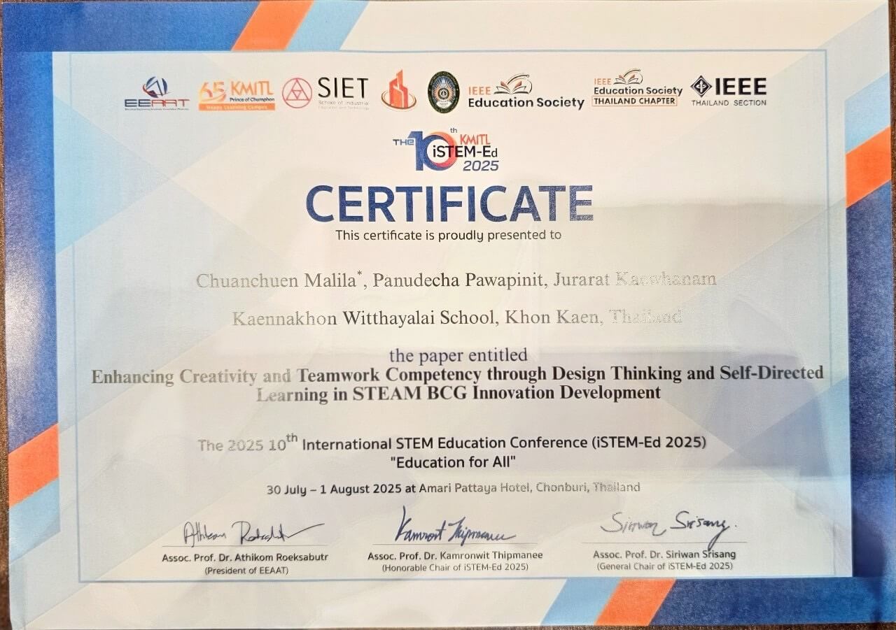 ทีมครูสะเต็มศึกษาของโรงเรียนแก่นนครวิทยาลัยสร้างชื่อเสียงให้กับสถานศึกษา เมื่อได้รับเลือกให้เข้าร่วมนำเสนองานวิจัยในการประชุมวิชาการระดับนานาชาติด้านสะเต็มศึกษา iSTEM-Ed 2025 ระหว่างวันที่ 29 กรกฎาคม – 1 สิงหาคม 2568 ณ โรงแรมอวารี พัทยา