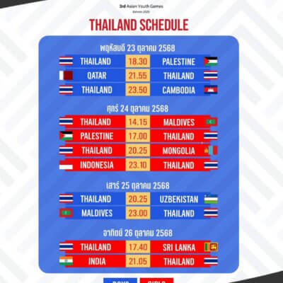 วันนี้ ทีมไทยจะเผชิญหน้ากับสามทีมในปะตูนเดียวกัน ได้แก่ ประเทศปาเลสไตน์ เวลา 18:30 น. ประเทศกาตาร์ เวลา 21:30 น. และประเทศกัมพูชา เวลา 23:50 น. การแข่งขันจะถ่ายทอดสดผ่านช่อง YouTube: https://www.youtube.com/@stadiumth3407