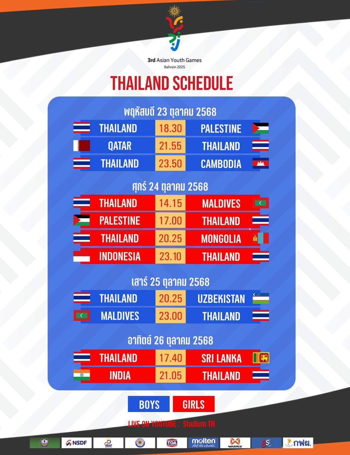 วันนี้ ทีมไทยจะเผชิญหน้ากับสามทีมในปะตูนเดียวกัน ได้แก่ ประเทศปาเลสไตน์ เวลา 18:30 น. ประเทศกาตาร์ เวลา 21:30 น. และประเทศกัมพูชา เวลา 23:50 น. การแข่งขันจะถ่ายทอดสดผ่านช่อง YouTube: https://www.youtube.com/@stadiumth3407