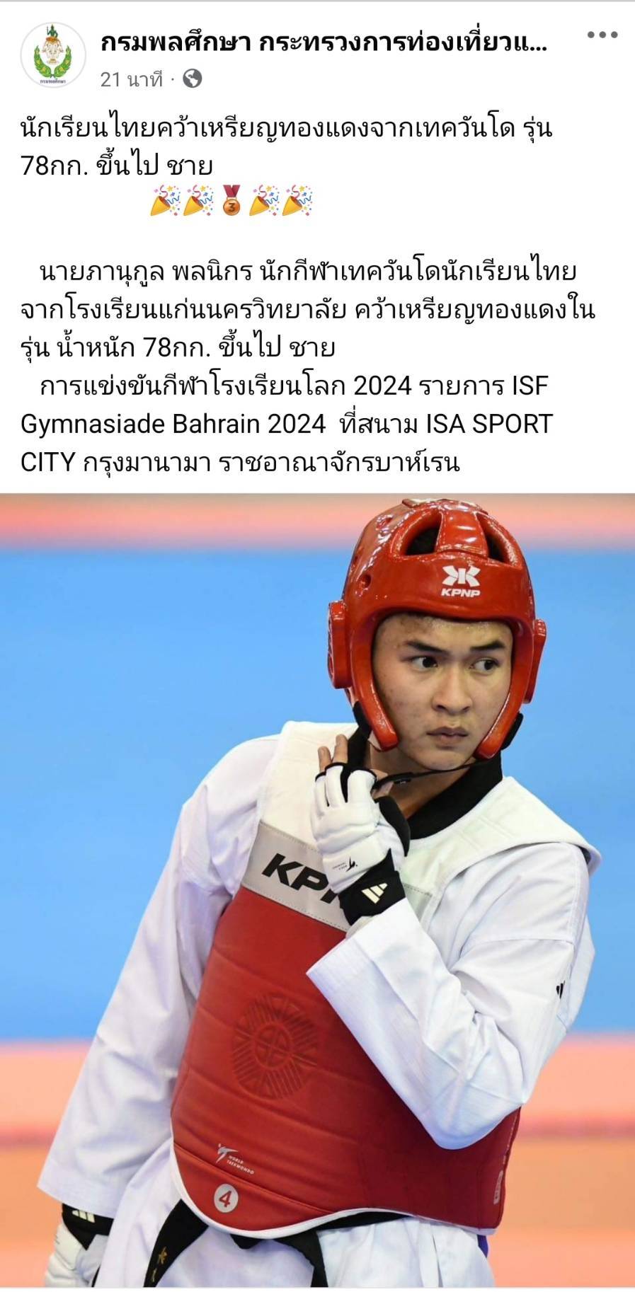 นับเป็นความภาคภูมิใจของชาวแก่นนครวิทยาลัยและประเทศไทย เมื่อ นายภานุกูล พลนิกร นักเรียนจากโรงเรียนแก่นนครวิทยาลัย สามารถคว้าเหรียญทองแดงจากการแข่งขันเทควันโด รุ่นน้ำหนัก 78 กิโลกรัมขึ้นไป ประเภทชาย ในการแข่งขันกีฬาโรงเรียนโลก 2024 (ISF Gymnasiade Bahrain 2024)