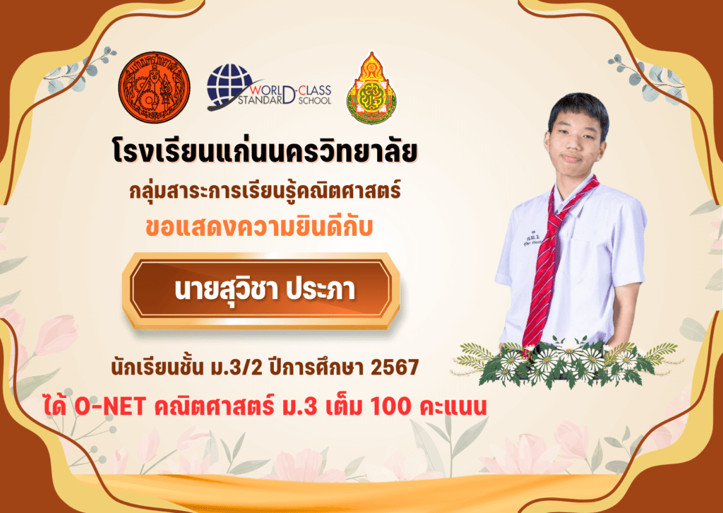 นายสุวิชา ประภา นักเรียนชั้น ม.3/2 และนายภูริพัฒน์ รองศักดิ์ นักเรียนชั้น ม.3/16 ประสบความสำเร็จในการสอบ O-NET ระดับ ม.3 ประจำปีการศึกษา 2567 ด้วยการทำคะแนนได้อย่างยอดเยี่ยมในรายวิชาคณิตศาสตร์