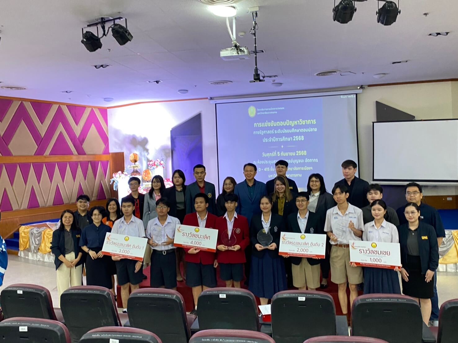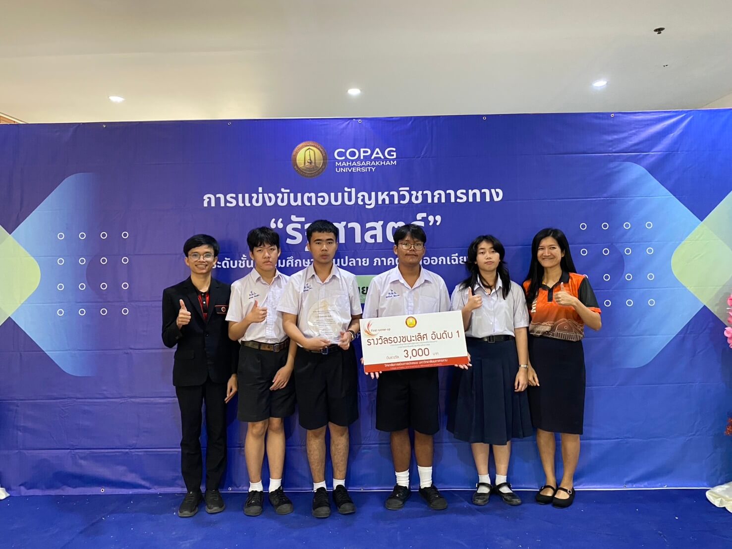 ทีมที่ 1 ของโรงเรียนสร้างความภาคภูมิใจ โดยคว้ารางวัลรองชนะเลิศอันดับ 1 และได้รับโล่ประกาศเกียรติคุณจากคณบดีวิทยาลัยการเมืองการปกครอง มหาวิทยาลัยมหาสารคาม พร้อมเงินรางวัล 3,000 บาท และเกียรติบัตร สมาชิกทีมประกอบด้วย นายพัทธ์นันท์ รัตโนภาส ชั้น ม.6/4 และนายวชิรวิชญ์ ปินะถา ชั้น ม.5/1
