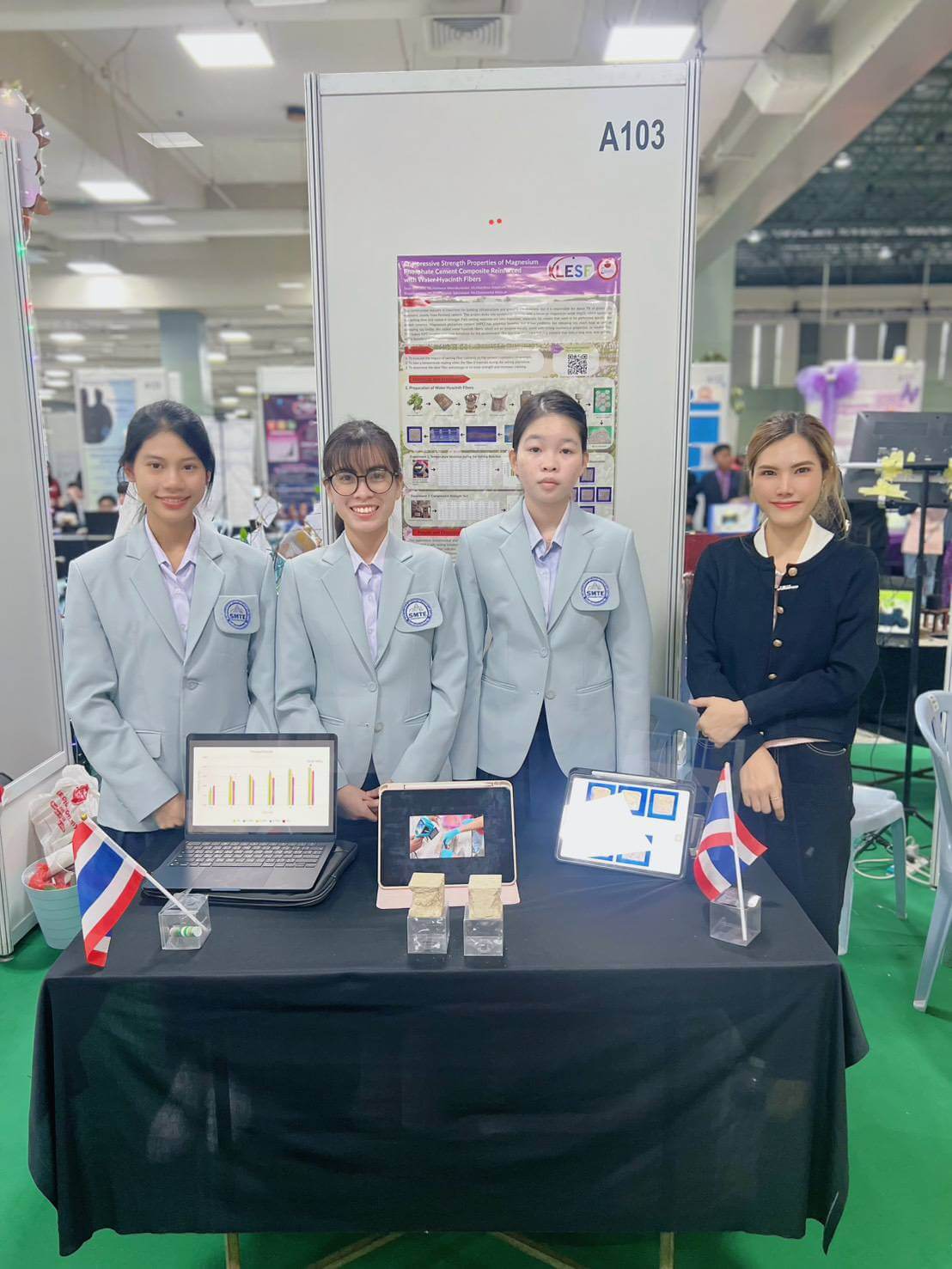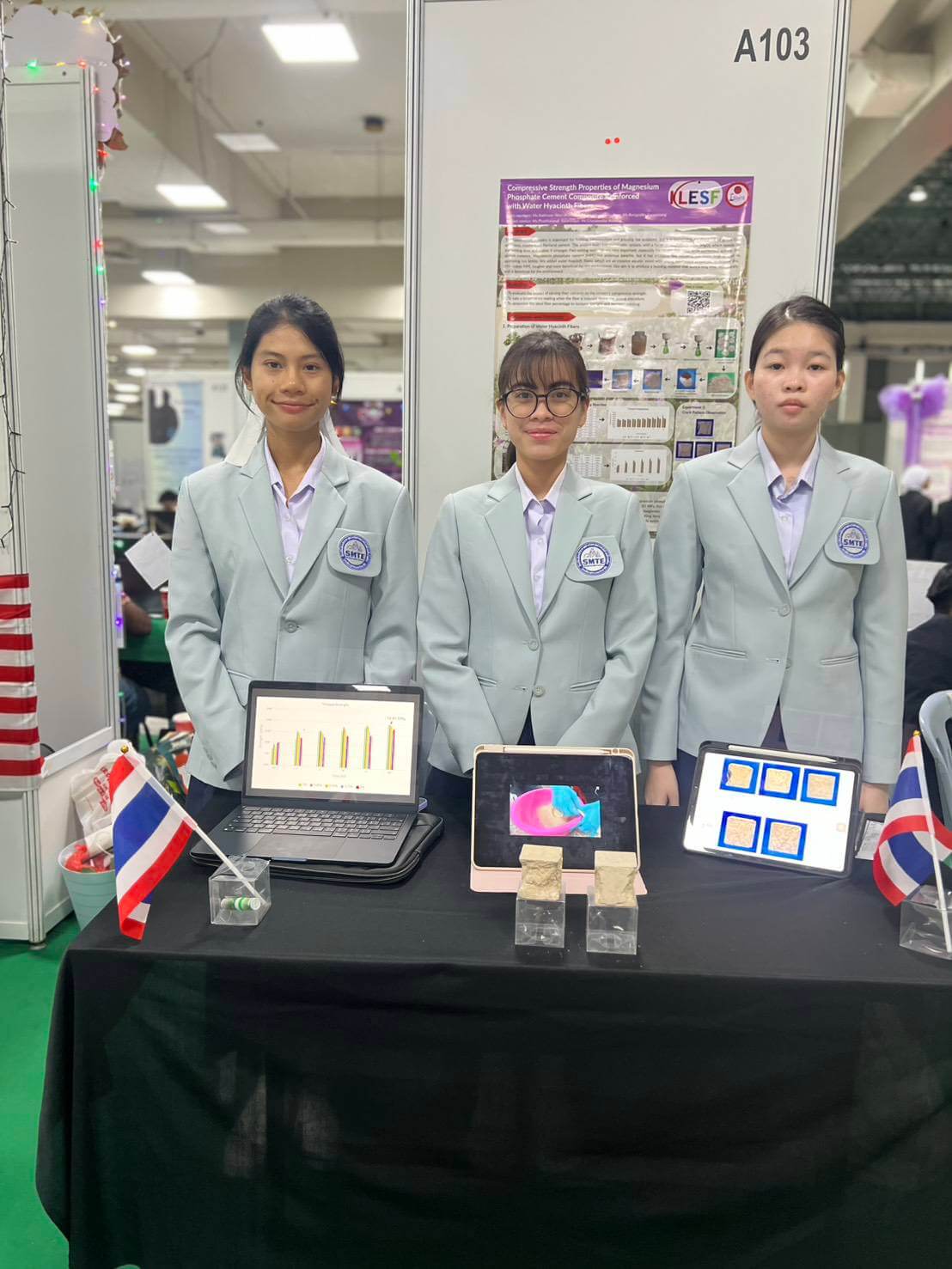 ทีมของนักเรียน ประกอบด้วย นางสาวนาขวัญ วีระกุลเกษตร นางสาวมัชฌิมา ศรีสุธรรม และนางสาวรุ่งไพลิน วุ้นสีแซง ทั้งศึกษาในชั้นมัธยมศึกษาปีที่ 6/1 ซึ่งนำเสนอโครงงานเรื่อง “Compressive Strength Properties of Magnesium Phosphate Cement Composite Reinforced with Water Hyacinth Fibers” ภายใต้การแนะนำของครูที่ปรึกษา นางสาวภัทรณัฎฐ์ ศตนันท์พัฒน์ และที่ปรึกษาพิเศษ ผศ.ดร.เจริญชัย ฤทธิรุทธ
