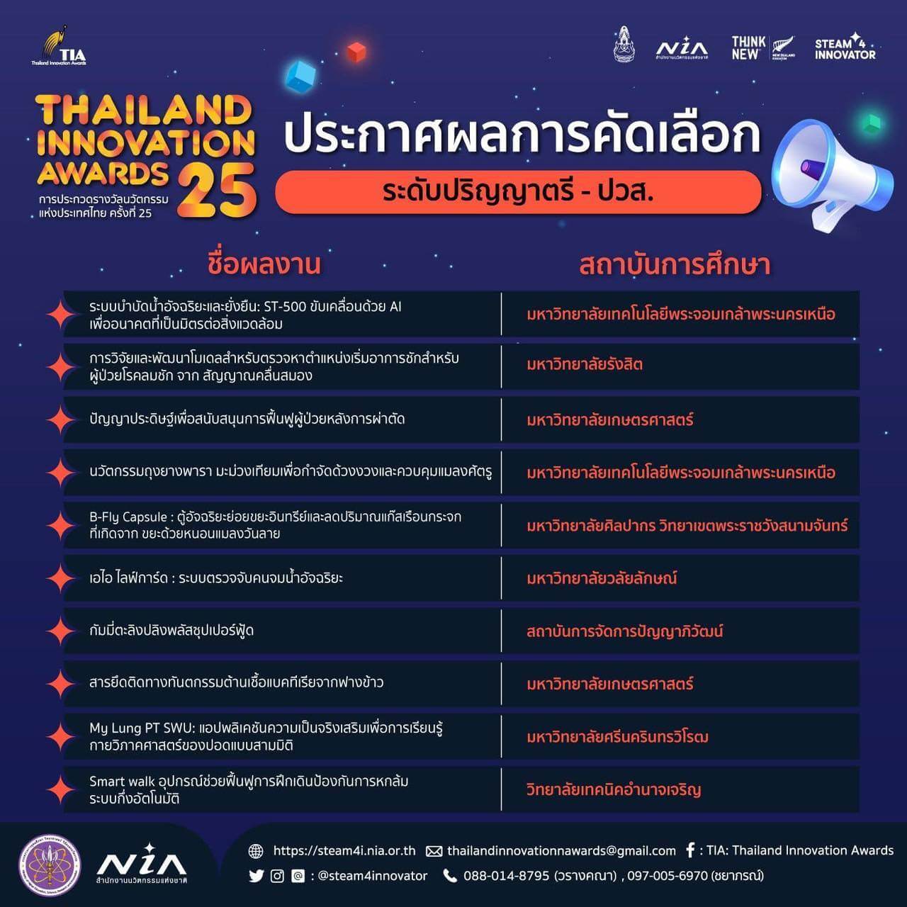 ผลงานนวัตกรรมด้านสะเต็มศึกษาของนายกฤตพล ชุนบุญมา และนางสาวมาติกา ธงสวัสดิ์ ได้ผ่านการคัดเลือกเข้าสู่รอบสุดท้าย เป็น 1 ใน 40 ทีมที่ผ่านเข้าร่วมโครงการ Thailand Innovation Award 2025 (TIA2025)