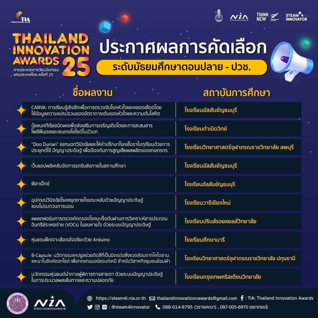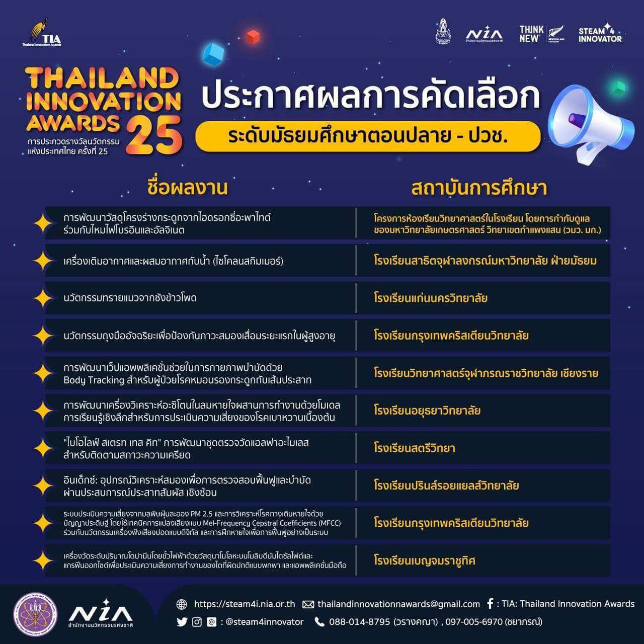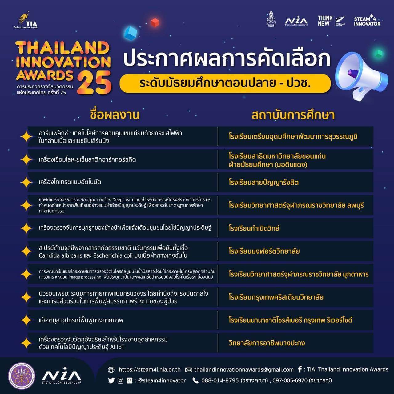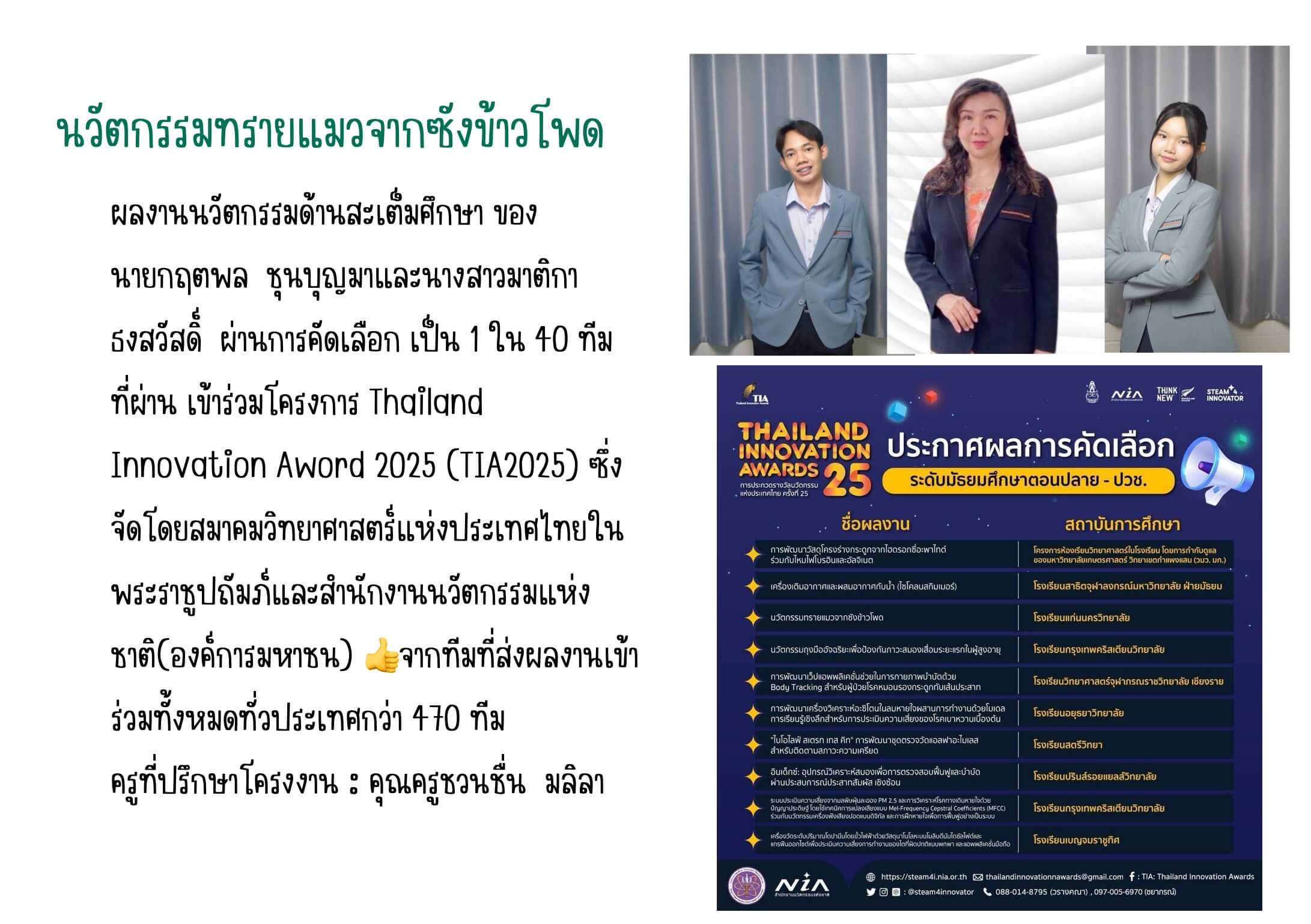 ผลงานนวัตกรรมด้านสะเต็มศึกษาของนายกฤตพล ชุนบุญมา และนางสาวมาติกา ธงสวัสดิ์ ได้ผ่านการคัดเลือกเข้าสู่รอบสุดท้าย เป็น 1 ใน 40 ทีมที่ผ่านเข้าร่วมโครงการ Thailand Innovation Award 2025 (TIA2025)