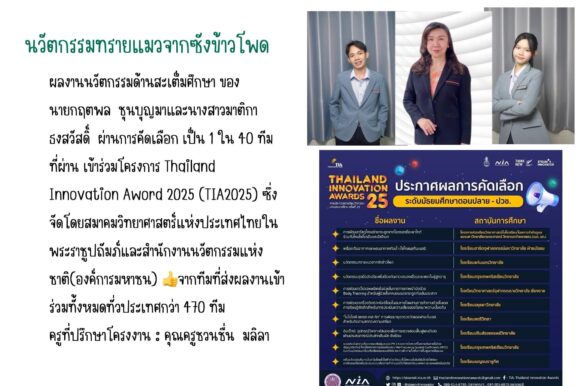 ผลงานนวัตกรรมด้านสะเต็มศึกษาของนายกฤตพล ชุนบุญมา และนางสาวมาติกา ธงสวัสดิ์ ได้ผ่านการคัดเลือกเข้าสู่รอบสุดท้าย เป็น 1 ใน 40 ทีมที่ผ่านเข้าร่วมโครงการ Thailand Innovation Award 2025 (TIA2025)