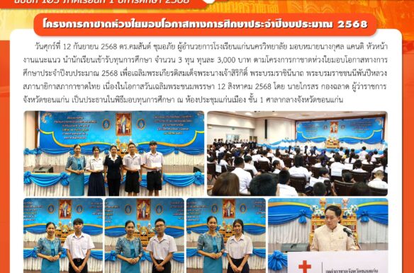 เมื่อวันศุกร์ที่ 12 กันยายน 2568 นักเรียนโรงเรียนแก่นนครวิทยาลัยได้รับเกียรติรับทุนการศึกษาจากโครงการกาชาดห่วงใยมอบโอกาสทางการศึกษา ประจำปีงบประมาณ 2568 จำนวน 3 ทุน ทุนละ 3,000 บาท โครงการนี้จัดขึ้นเพื่อเฉลิมพระเกียรติสมเด็จพระนางเจ้าสิริกิติ์ พระบรมราชินีนาถ พระบรมราชชนนีพันปีหลวง สภานายิกาสภากาชาดไทย เนื่องในโอกาสวันเฉลิมพระชนมพรรษา 12 สิงหาคม 2568 พิธีมอบทุนการศึกษาจัดขึ้น ณ ห้องประชุมแก่นเมือง ชั้น 1 ศาลากลางจังหวัดขอนแก่น โดยมีนายไกรสร กองฉลาด ผู้ว่าราชการจังหวัดขอนแก่น เป็นประธานในพิธี ทางโรงเรียนแก่นนครวิทยาลัยส่งคณะนักเรียนเข้ารับทุนโดยมี นางกุศล แคนติ หัวหน้างานแนะแนว เป็นผู้นำคณะ ตามคำมอบหมายจาก ดร.คมสันต์ ชุมอภัย ผู้อำนวยการโรงเรียน ในโอกาสนี้ นางกรรณิกา กองฉลาด นายกเหล่าชาดจังหวัดขอนแก่น นางนิตินันนท์ รักแพทย์ รองนายกเหล่ากาชาดจังหวัดขอนแก่น และกรรมการเหล่ากาชาดจังหวัดขอนแก่น ได้ร่วมมอบทุนการศึกษาให้แก่นักเรียนในครั้งนี้ แหล่งที่มา: […]