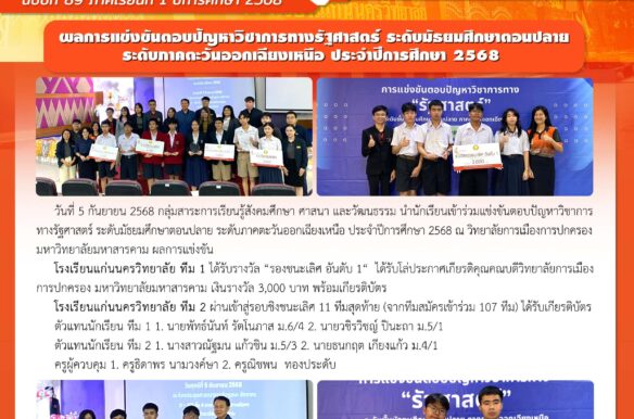 กลุ่มสาระการเรียนรู้สังคมศึกษา ศาสนา และวัฒนธรรม โรงเรียนแก่นนครวิทยาลัย นำนักเรียนเข้าร่วมการแข่งขันตอบปัญหาวิชาการทางรัฐศาสตร์ ระดับมัธยมศึกษาตอนปลาย ระดับภาคตะวันออกเฉียงเหนือ ประจำปีการศึกษา 2568 เมื่อวันที่ 5 กันยายน 2568 ณ วิทยาลัยการเมืองการปกครอง มหาวิทยาลัยมหาสารคาม ทีมที่ 1 ของโรงเรียนสร้างความภาคภูมิใจ โดยคว้ารางวัลรองชนะเลิศอันดับ 1 และได้รับโล่ประกาศเกียรติคุณจากคณบดีวิทยาลัยการเมืองการปกครอง มหาวิทยาลัยมหาสารคาม พร้อมเงินรางวัล 3,000 บาท และเกียรติบัตร สมาชิกทีมประกอบด้วย นายพัทธ์นันท์ รัตโนภาส ชั้น ม.6/4 และนายวชิรวิชญ์ ปินะถา ชั้น ม.5/1 ทีมที่ 2 ก็แสดงผลงานที่น่าชื่นชม โดยผ่านเข้าสู่รอบชิงชนะเลิศ 11 ทีมสุดท้าย จากทีมที่สมัครเข้าร่วมทั้งหมด 107 ทีม และได้รับเกียรติบัตร สมาชิกทีมคือ นางสาวณัฐมน แก้วชิน ชั้น […]