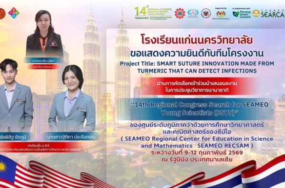 นางสาวฐิติภา ประจันตเสน นักเรียนชั้นมัธยมศึกษาปีที่ 6/3 จากโรงเรียน และนายชัชพิสิฐ อัตภูมิ นักเรียนจากโรงเรียนแก่นนครวิทยาลัย ได้รับการคัดเลือกเพื่อนำเสนอผลงานวิจัยเรื่อง “SMART SUTURE INNOVATION MADE FROM TURMERIC THAT CAN DETECT INFECTIONS” หรือ “นวัตกรรมไหมเย็บแผลอัจฉริยะจากขมิ้นชันที่สามารถตรวจจับเชื้อได้” ขอแสดงความยินดีกับทีมโครงงานที่ผ่านการคัดเลือกนำเสนอผลงาน เพื่อประกวดนวัตกรรมในงาน “14th Regional Congress Search for SEAMEO Young Scientists (SSYS)” โดยมีการสนับสนุนจากศูนย์ภูมิภาคว่าด้วยการศึกษาวิทยาศาสตร์และคณิตศาสตร์ของซีมีโอ (SEAMEO Regional Center for Education in Science and Mathematics: SEAMEO RECSAM) ระหว่างวันที่ 9-12 กุมภาพันธ์ 2569 ณ ประเทศมาเลเซีย […]