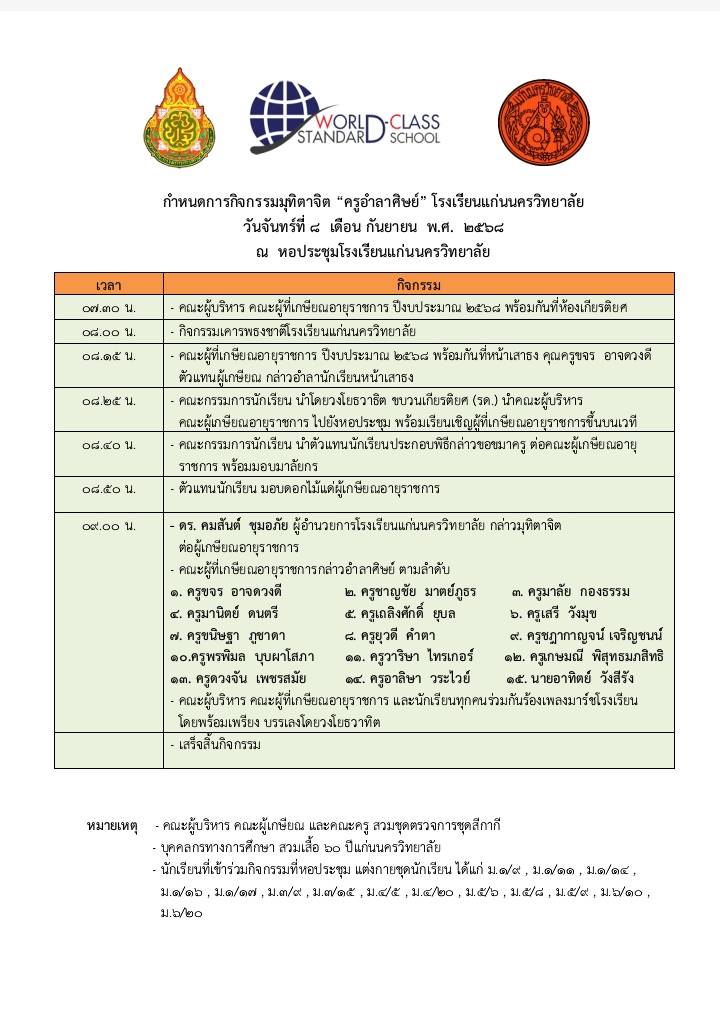 ด้วยโรงเรียนแก่นนครวิทยาลัย ได้จัดงานมุทิตาจิต “ครูอำลาศิษย์” ประจำปีงบประมาณ พ.ศ. 2568 ในวันจันทร์ ที่ 8 ก.ย. 2568 เวลา 08.00 น. ณ หอประชุมโรงเรียนแก่นนครวิทยาลัย