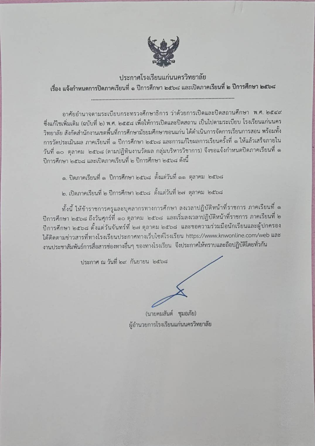 ประกาศโรงเรียนแก่นนครวิทยาลัย