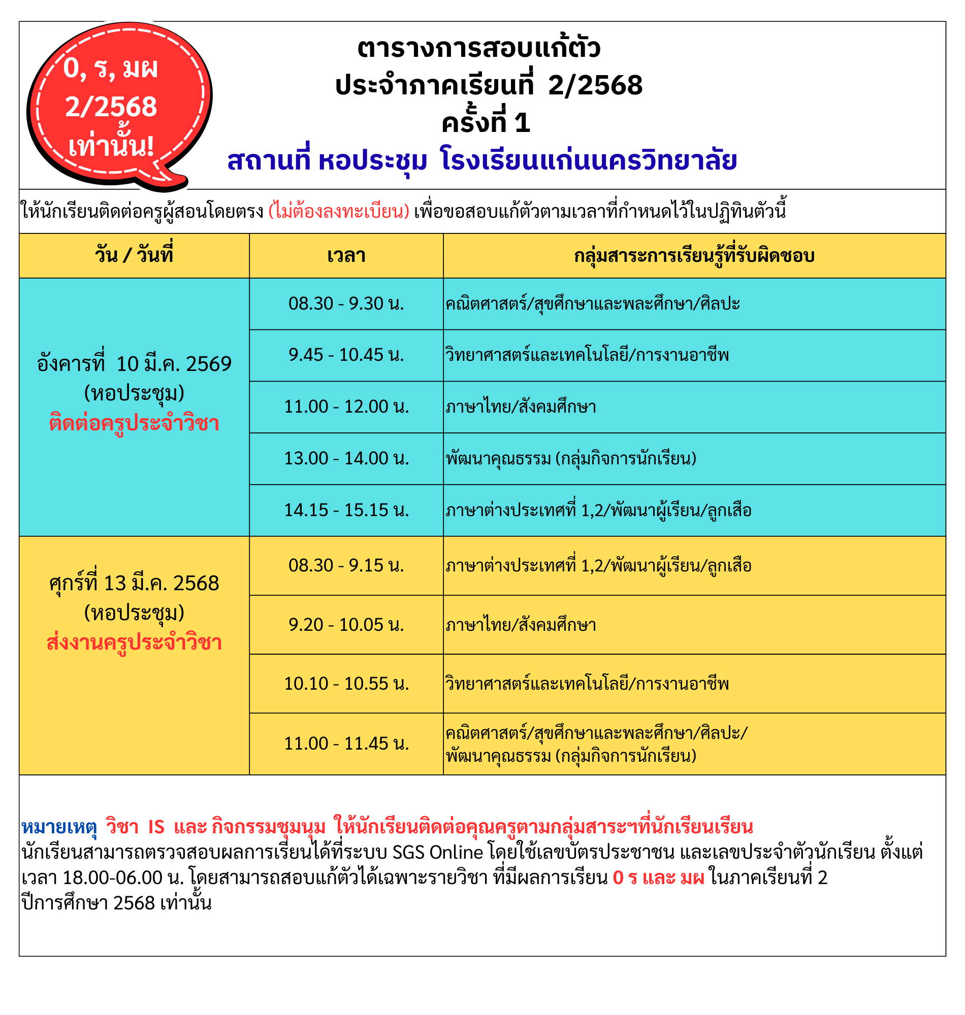 ตารางการสอบแก้ตัว ประจำภาคเรียน 2/2568 ครั้งที่ 1
